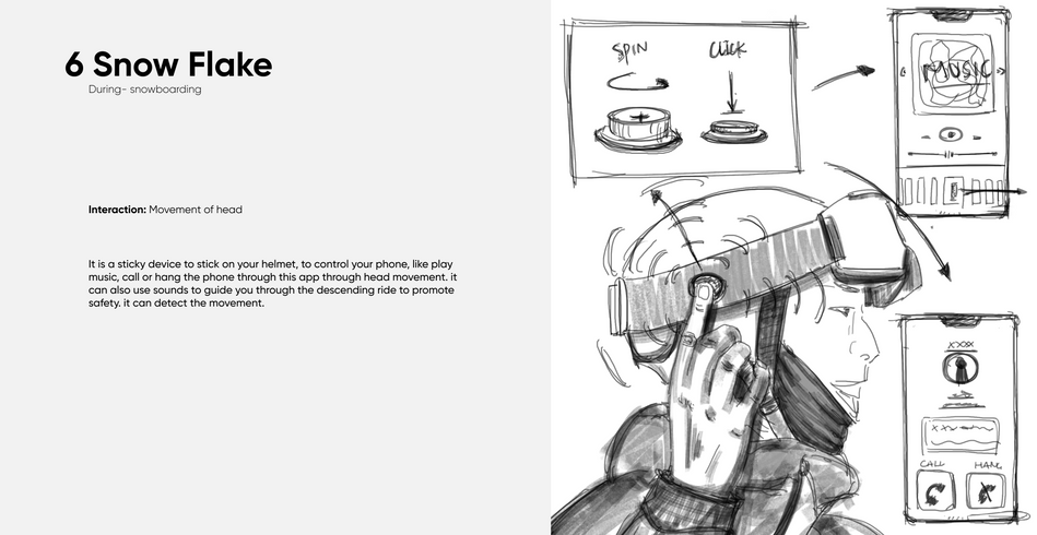 The final concept is a combination of my previous two ideas, the board buddies and snow music. One is aimed to make friends with other, the other is aimed to promote music experience. The main innovation of this two concepts is all about getting rid of phone and use hand gesture to navigate. Thus, I found there is a potential to combine to two.